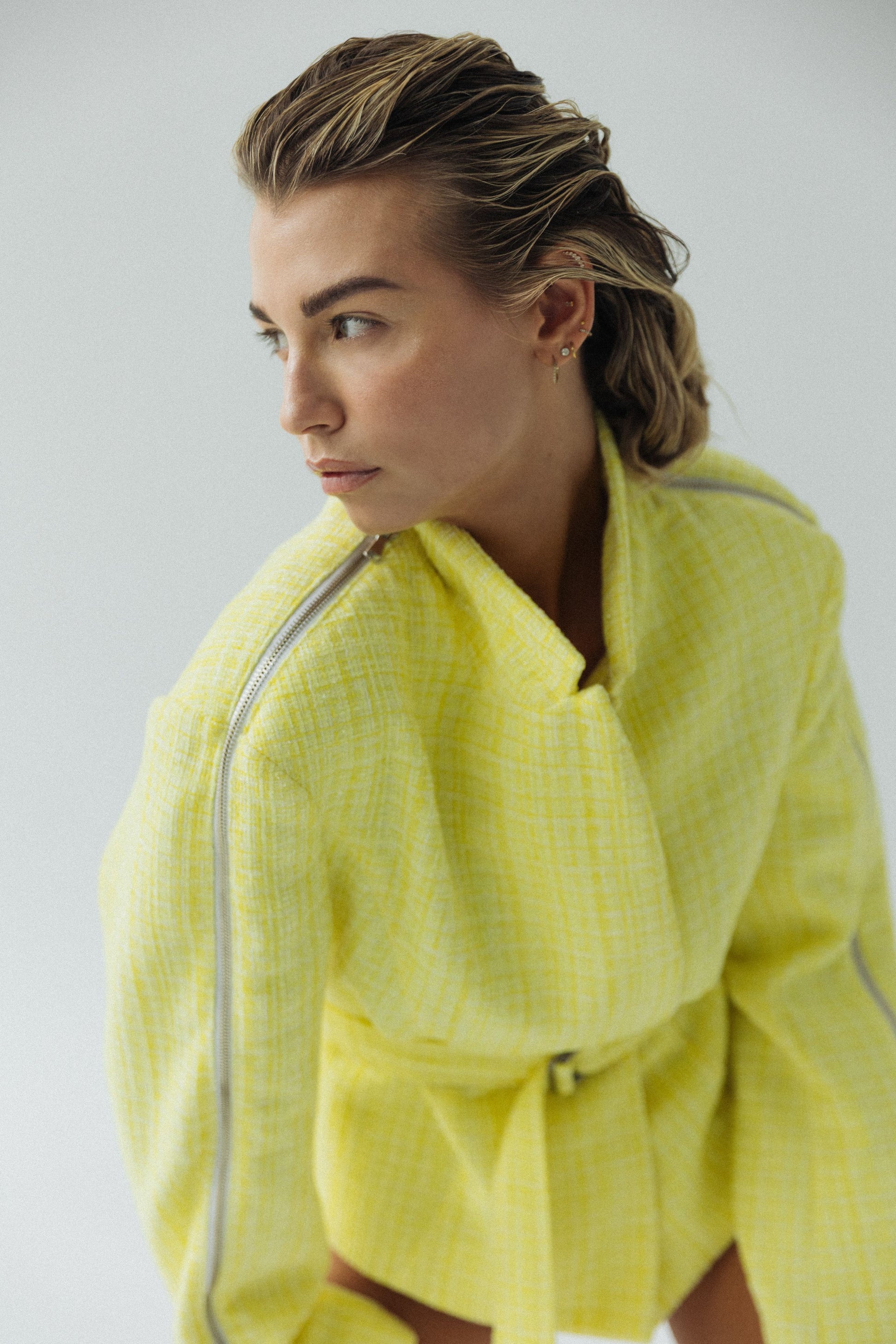 Strukturirana jakna prepoznatljiva po ravnim linijama, metalnim rajsferšlusima i pojasu koji naglašava siluetu, TORA spaja oštrinu forme sa lakoćom pokreta.