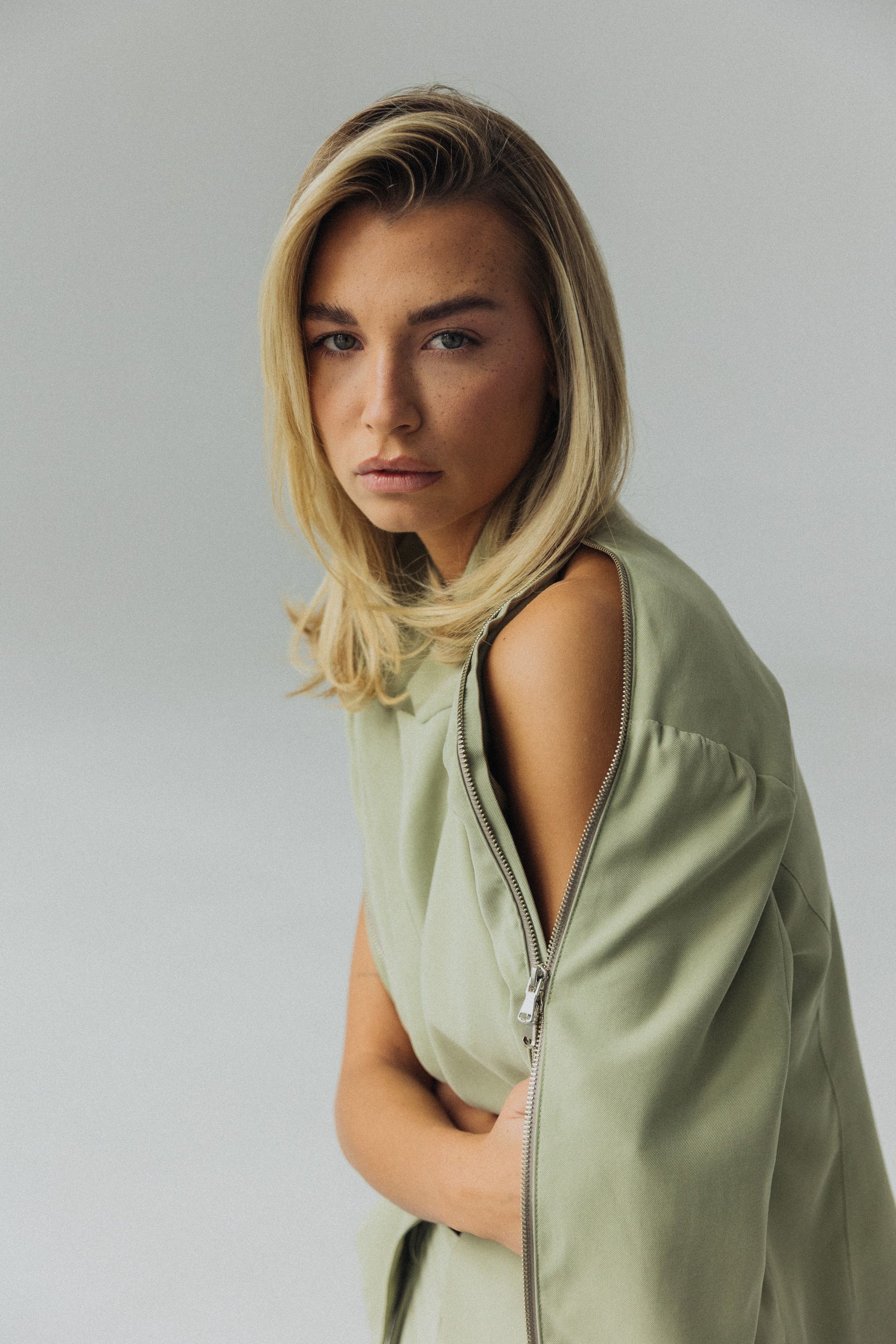 Blazer made of viscose fabric with a subtle texture and distinctive metal zippers along the sleeves.