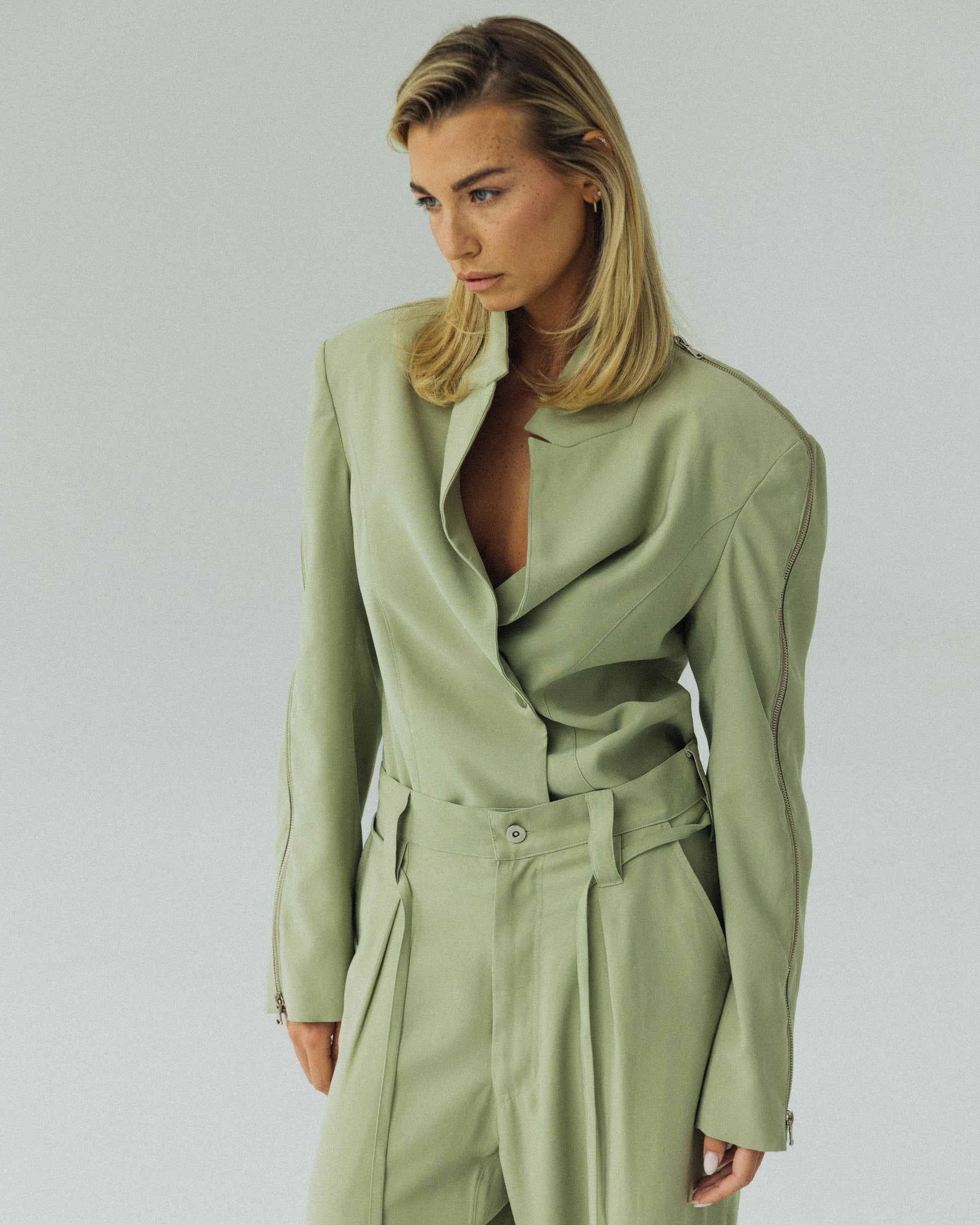 The zippers open in both directions, allowing multiple ways to wear and style the piece — from a classic tailored look to a more relaxed silhouette.